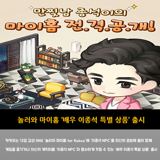 카카오는 13일 감성 SNG '놀러와 마이홈 for Kakao'에 '이종석 NPC'를 자신의 공방에 불러 함께 게임을 즐기거나 자신의 캐릭터를 '이종석 NPC'와 흡사하게 꾸밀 수 있는 '배우 이종석 특별 상품' 출시