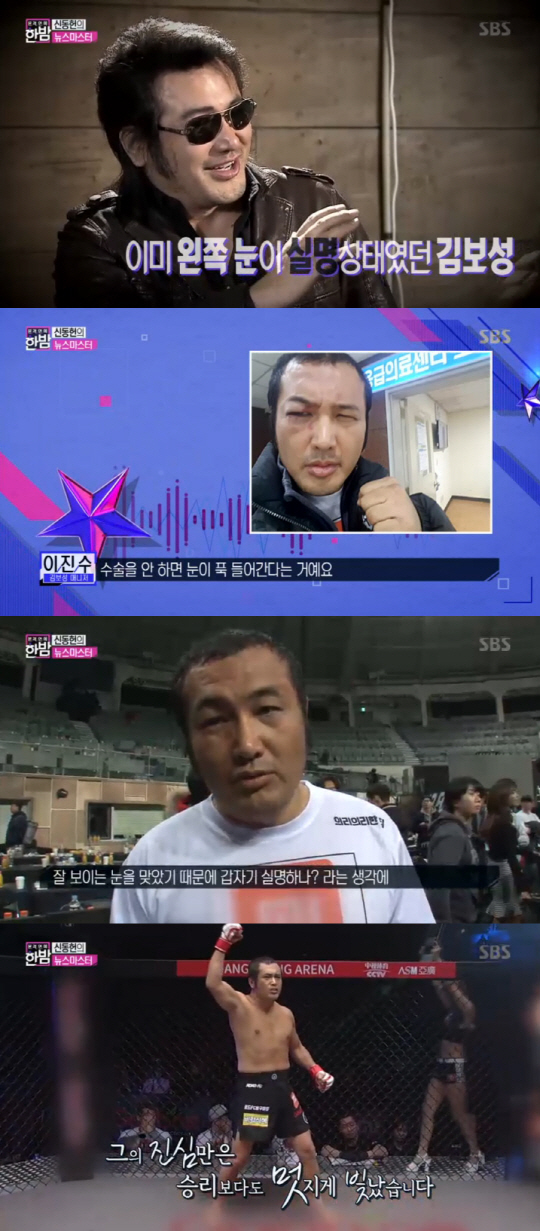 한밤 측은 김보성 매니저와 전화 인터뷰를 통해 그의 근황을 전했다. 매니저는 "안와골절이라는 것은 저도 처음 들었다. 말 그대로 뼈가 골절됐다. 수술을 안 하면 눈이 푹 들어간다고 하더라"라며 "부기도 빠지고 경과보고하고 수술 날짜 잡기로 했다. 장담은 못하는 거고 경과를 하루하루 보고 있다"고 말했다. tokkig@sportschosun.com