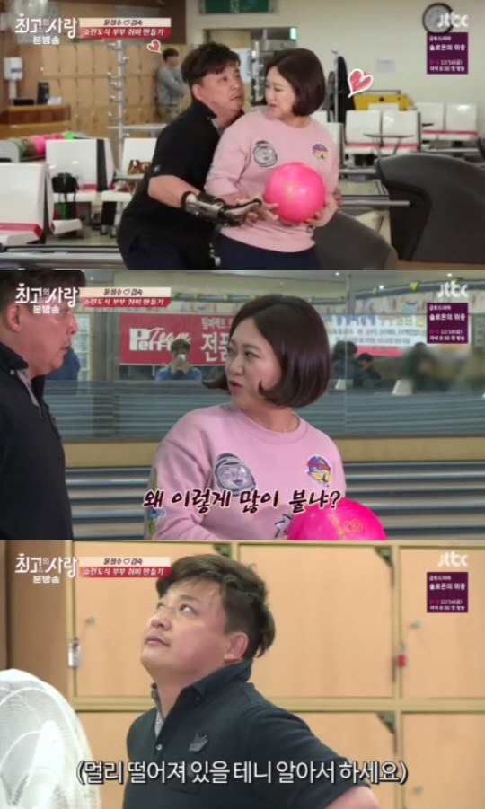 13일 밤 방송된 JTBC '님과 함께 시즌2-최고(高)의 사랑'에서는 부부 공동 취미를 찾기 위해 볼링장을 찾은 윤정수-김숙의 모습이 그려졌다.