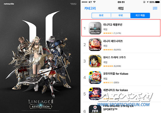 '리니지 2: 레볼루션'은 사전 예약 참가자가 340만 명을 넘어서고, 공식 카페 회원 수가 46만 명을 넘어서며 하반기 최대의 기대작으로 온라인 게임 '리니지 2'를 그대로 모바일로 옮겨왔다는 평을 받았고 수많은 유저들의 기대를 한 몸에 받으며 출시되었고, 출시 9시간만에 국내 애플 앱스토어 매출 순위 1위를 기록하며 흥행 폭풍을 예고하고 있다.