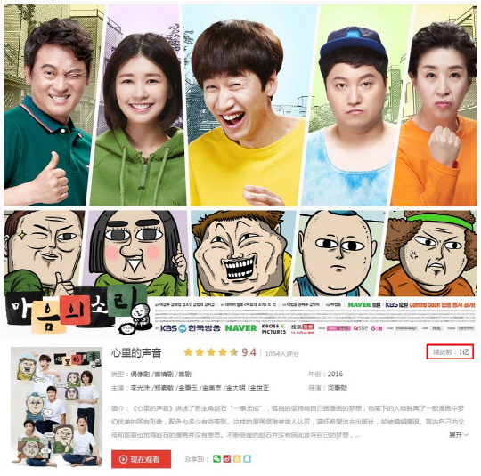 KBS 2TV 시트콤 '마음의 소리'(연출 하병훈/ 제작 마음의 소리 문화산업전문회사)가 지난 11월 7일 중국 소후닷컴을 통해 본편이 첫 공개된 이래 1억뷰(16.12.15기준)를 돌파하는 기록을 세우며 대륙을 핫하게 달구고 있다.