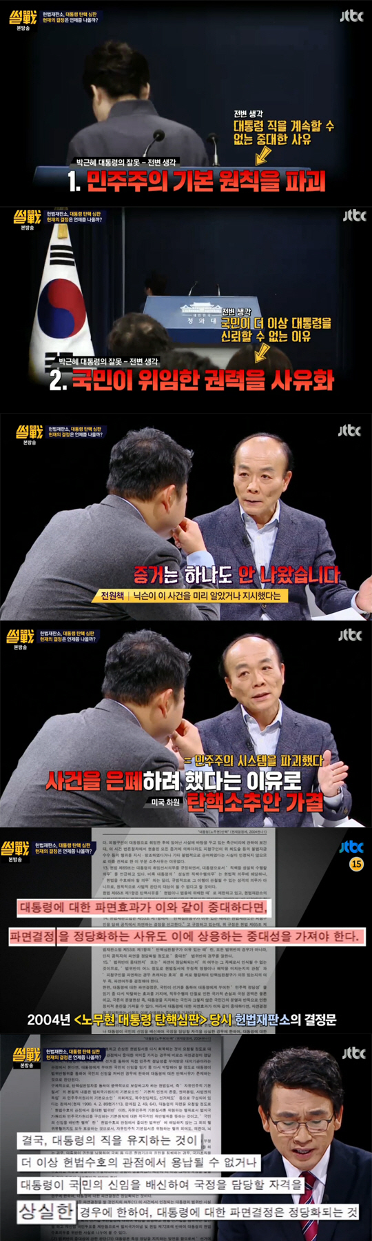 이어 '국내에 탄핵사례가 별로 없다'면서 미국 전 대통령 닉슨을 제시했다. 그는 "워터게이트 사건 때 닉슨이 그 사건에 대해 알고 있다는 증거는 하나도 안나왔다. 그 사건을 은폐하려했다는 혐의로 탄핵당한 것"이라고 설명했다.