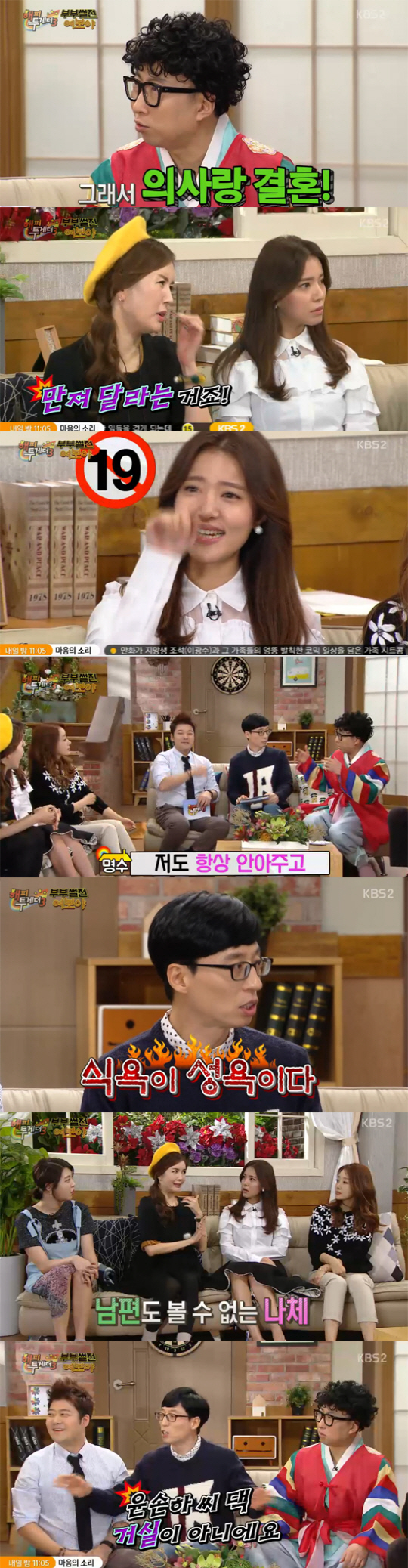 [스포츠조선 이유나 기자] 윤손하가 쏘아 올린 '박명수의 낮이밤져' 폭로가 착한 예능 '해투'의 본격 19금 부부방송의 시작을 열었다.