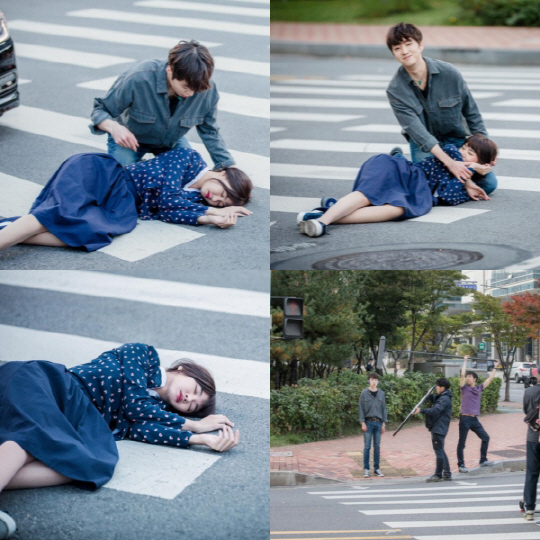 사진 속 극중 여주인공 '편미조(황승언 분)'는 횡단보도에서 교통사고를 당한 듯 쓰러져 있다. 남주인공이자 힙합크루 크렁크소울의 리더 '유준우(강승윤 분)'는 이러한 '미조'를 끌어안고 당황하며 어찌할 바 모르는 모습이다.