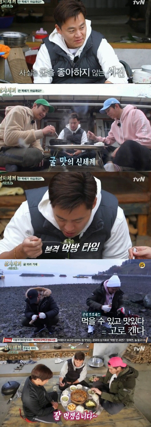 세끼하우스로 돌아온 윤균상은 굴 껍질을 벗겨 손질했고, 에릭도 다른 재료들을 준비해 요리, 굴국밥을 완성했다. 앞서 굴을 좋아하지 않는다고 털어놨던 이서진은 에릭의 굴국밥을 먹고는 "어허이구"고 감탄사를 내뱉으며 폭풍흡입했다. 그는 "굴 잘 안 좋아하는데"라고 말하며 자꾸만 먹게돼 스스로를 의아하게 생각했다. 나영석 PD가 "원래 굴 싫어하지 않느냐"고 묻자 이서진은 "자연산 체질인가 보다"라고 너스레를 떨었다.