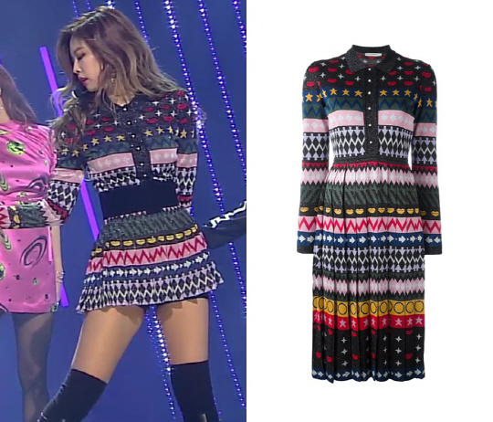 다양한 패턴이 블로킹 되어 색다른 스트라이프를 형성한 원피스다. 캐주얼한 셔츠 스타일이라 과감한 프린트에도 불구하고 비교적 시도하기 편한 스타일이다. 제니의 원피스는 그리스 출신의 디자이너 마리 카트란주(Mary Katrantzou)의 제품으로 화려하면서도 파격적인 디지털 프린팅으로 주목받는 컬렉션이기도 하다. 본 아이템은 미디 길이의 플리츠로 여성스러움이 느껴지는 반면, 제니는 짧은 기장과 허리 밴드로 웨이스트 라인을 강조해 발랄하게 연출했다.