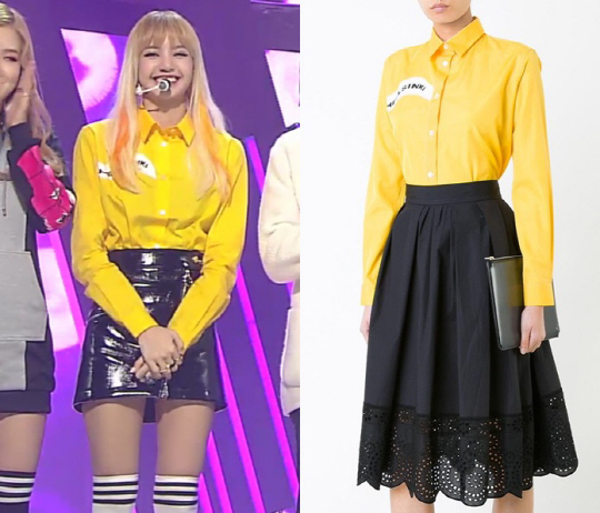 노랑과 검정. 리사는 폴리스 라인을 연상시키는 색상의 매치도 과감히 소화하는 패셔너블한 모습을 보였다. 기본 셔츠는 샛노랑을 입고 유니크하게 변신했고, 여기에 글로시한 광택감이 돋보이는 가죽 치마로 에지를 더했다. 리사가 입은 셔츠는 핀란드 출신의 디자이너 투오마스 메리코스키가 전개하는 알토(AALTO) 제품이다. 90년대 핀란드 클럽 키드들의 감성과 북유럽 특유의 색감이 특징.