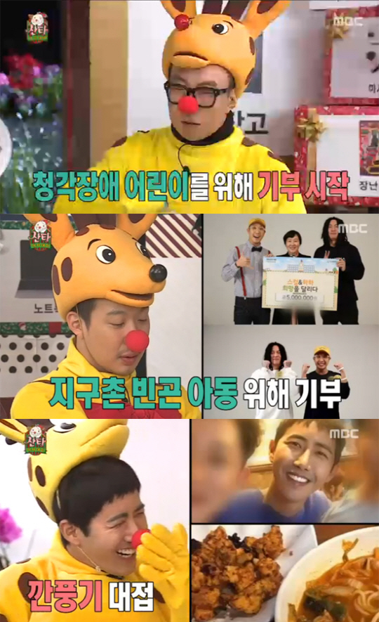 마지막에는 재석산타와 루돌프들의 선물배송 작전이 펼쳐졌다. 그에 앞서 유재석은 멤버들의 선행에 대한 미담을 정리해 공개했다. 유재석은 "박명수가 도로 위의 성자 별명을 얻었던 사고가 있었다. 당시 뒤에서 친 택시 기사에게 따지지 않고 자신의 차를 직접 수리하는 미담이 있었다"고 말했고, 그동안 옆에서 무언가를 적고 있던 박명수는 "최근 청각 장애우들을 위한 기부를 시작했다"고 본인의 미담을 추가 공개했다.
