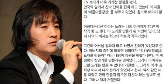 [스포츠조선닷컴 이지현 기자] 기타리스트 신대철이 자신의 아버지가 자곡한 '아름다운 강산'을 박사모ㆍ어버이연합이 불렀다는 소식에 불편한 심기를 드러냈다.