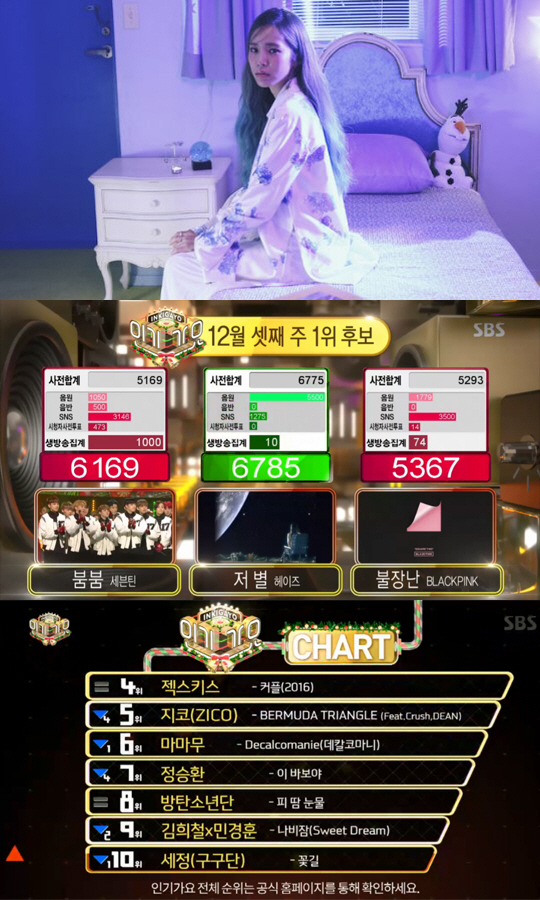 18일 SBS '인기가요'에서는 헤이즈의 '저 별'이 1위를 차지했다. 헤이즈는 12월 셋째주 1위 후보에 함께 오른 세븐틴의 '붐붐'과 블랙핑크의 '불장난'을 꺾고 1위에 올랐다.