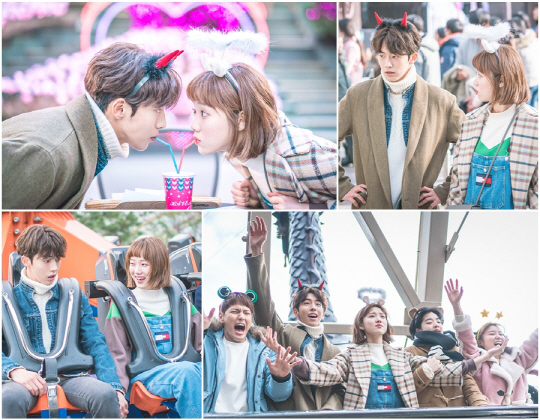 이와 관련 이성경이 남주혁과 각각 천사와 악마 머리띠를 한 채 이주영(이선옥 역), 조혜정(정난희 역), 지일주(조태권 역)와 함께 놀이기구를 타며 즐거운 한때를 보내고 있는 모습이 포착된 것. 더욱이 두 사람은 손을 꼭 잡은 채 나란히 놀이기구에 앉아 있는가 하면, 컵 한 개에 빨대 두 개를 꼽고 얼굴을 밀착한 채 음료수를 마시는 모습으로 설렘 가득한 데이트 장면을 완성시키고 있다.