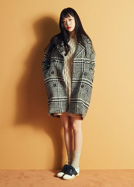 설리는 머스타드 컬러 니트에 트렌디한 패턴이 돋보이는 플리츠 스커트를 매치했다. 그리고 블랙 컬러의 체크 발마칸 코트를 매치. 슈즈 마저 유니크한 아우라를 풍기는 설리의 스타일링은 머리부터 발끝까지 감각적이면서도 따뜻한 감성이 묻어 나온다.