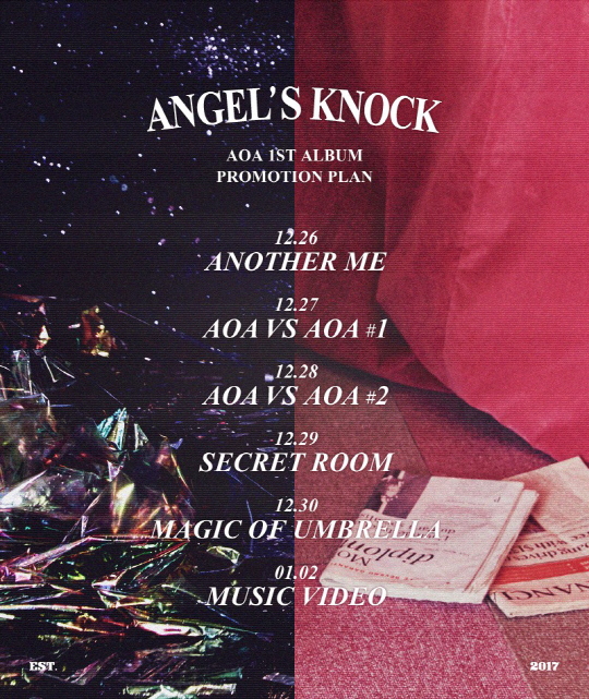[스포츠조선 이유나 기자]걸그룹 AOA(지민 초아 유나 혜정 민아 설현 찬미)가 내년 1월 2일 첫 번째 정규 앨범 '엔젤스 노크(ANGEL'S KNOCK)'를 들고 컴백한다.