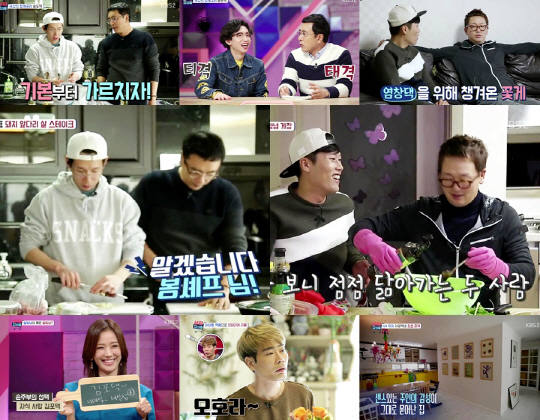 [스포츠조선닷컴 정안지 기자]배우 김승우-봉태규, 젠틀남 김정태-김일중이 세련된 모습과는 상반된 깐깐하고 허당기 가득한 살림솜씨를 펼치며 티격태격 '살림 브로맨스'를 폭발시켜 웃음을 선사했다.