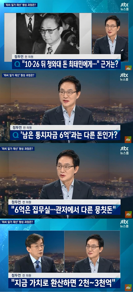 [스포츠조선 이유나 기자] 정두언 전 의원이 "박근혜 대통령이 10.26이후 최태민 일가에 준 재산이 현재 가치로 환산하면 2000~3000억 정도의 어마어마한 액수"라고 밝혔다.