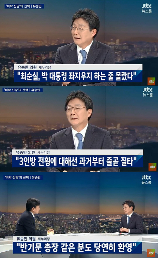 손석희 앵커는 '박근혜 대통령 비서실장도 지내셨고, 최순실씨와의 관계는 수십년된 관계인데 정말 모르셨느냐'고 물었고, 유 의원은 "최순실이라는 분이 정윤회 처고 최태민의 딸이고 저도 그정도는 알고 있었다. 최순실이라는 분이 박근혜 대통령 국회의원 뒤에서 좌지우지 하는 것을 알았다면 제가 가만히 있지 않았을 것"이라고 강하게 말했다.
