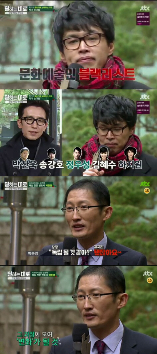 하지만 "최근에 모든 등장인물이 실명이고 실존 인물이고 살아있는 용기 있는 작품이 나타났다. 그 작품의 이름은 문화예술인 블랙리스트. 9000명의 인물이 들어가 있는 대작"이라고 비판했다.