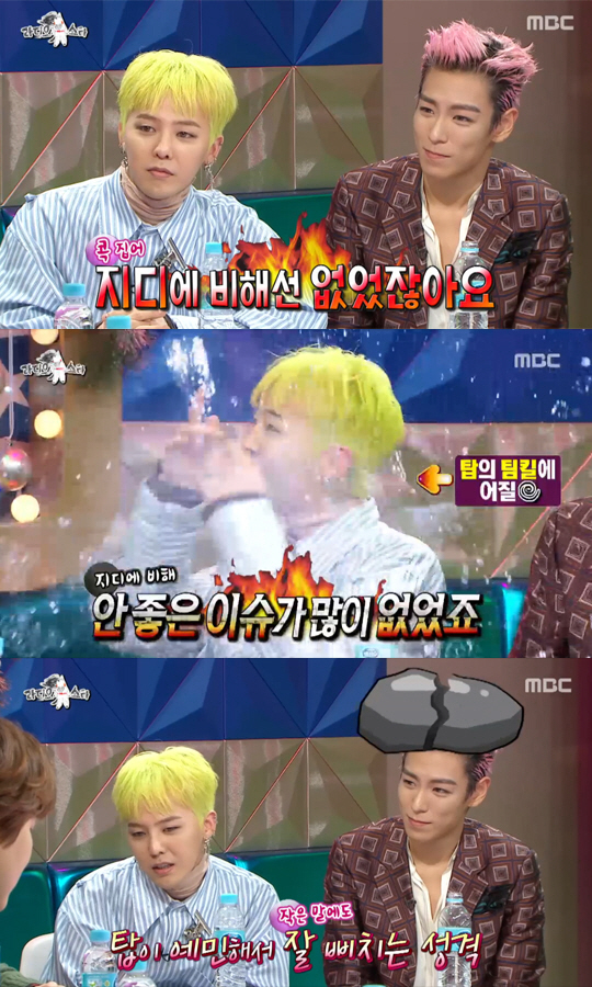 이에 탑은 "안 좋은 이슈가 많이 없었죠"라며 웃었다. 지드래곤은 잠시 얼얼한 표정을 지은 뒤 "탑이 예민해서 잘 삐치는 성격이다. 최근 무한도전 녹화중에도 '여동생에게 소개시켜주고 싶지 않은 멤버'로 꼽히자 삐쳤다"고 덧붙였다.