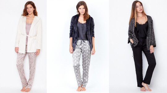 아직 풋풋한 커플들이 란제리 선물이 부끄럽다면 가운-캐미솔-팬츠로 구성 된 3pcs파자마 세트를 추천한다. 크리스마스 기념으로 첫 여행을 계획하고 있다면 더욱 금상첨화. 너무 노골적이지 않으면서도 편안한 분위기를 줄 수 있는 쓰리피스 파자마는 레이어드 룩으로 연출할 수 있어 4계절 활용이 가능하다. 캐미솔과 팬츠는 피부에 바로 닿는 아이템인만큼 물세탁이 용이한 부드러운 소재를 고를 것. 가운으로는 유행을 타지않는 클래식한 디자인이나 은은한 톤으로 연출되었다.
