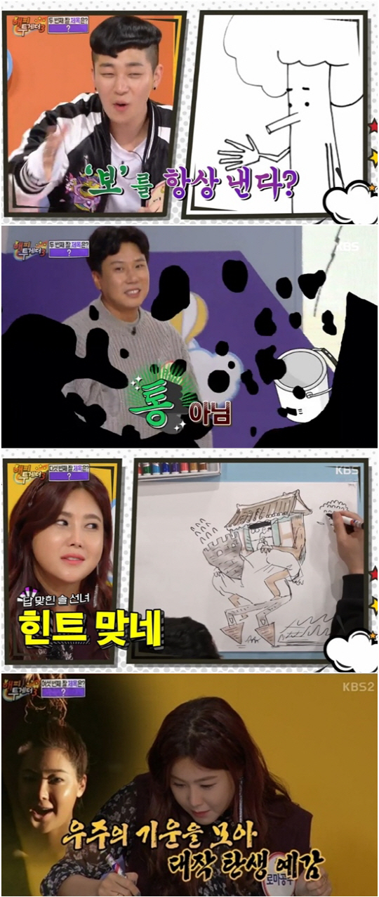 예를 들어 박 위에 칼이 꽂혀있는 그림의 답은 '박보검', 소가 구걸을 하고 있는 모습은 '우거지'라는 식이다. 단어를 듣고 즉석에서 생각해내는 독특한 발상, 정답을 알고나면 무릎을 치게되는 신선함이 묘미다. 갖은 방법을 동원해 해석하는 과정에서 탄생한 다채로운 오답들 또한 웃음요소다.