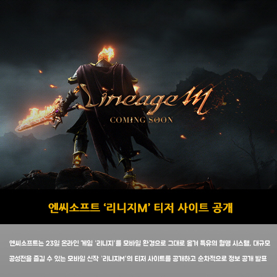 엔씨소프트는 23일 온라인 게임 '리니지'를 모바일 환경으로 그대로 옮겨 특유의 혈맹 시스템, 대규모 공성전을 즐길 수 있는 모바일 신작 '리니지M'의 티저 사이트를 공개하고 순차적으로 정보 공개 발표