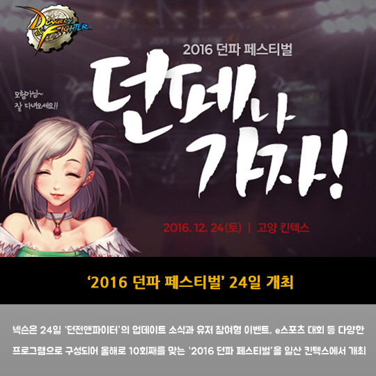 넥슨은 24일 '던전앤파이터'의 업데이트 소식과 유저 참여형 이벤트, e스포츠 대회 등 다양한 프로그램으로 구성되어 올해로 10회째를 맞는 '2016 던파 페스티벌'을 일산 킨텍스에서 개최