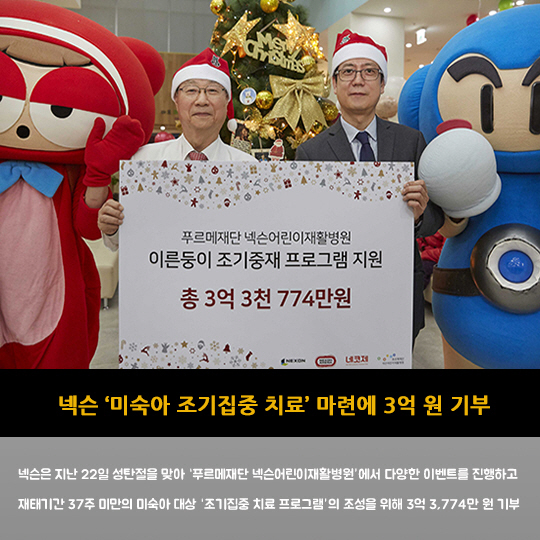 넥슨은 지난 22일 성탄절을 맞아 '푸르메재단 넥슨어린이재활병원'에서 다양한 이벤트를 진행하고 재태기간 37주 미만의 미숙아 대상 '조기집중 치료 프로그램'의 조성을 위해 3억 3,774만 원 기부