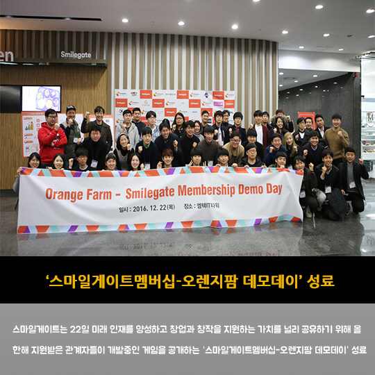 스마일게이트는 22일 미래 인재를 양성하고 창업과 창작을 지원하는 가치를 널리 공유하기 위해 올 한해 지원받은 관계자들이 개발중인 게임을 공개하는 '스마일게이트멤버십-오렌지팜 데모데이' 성료