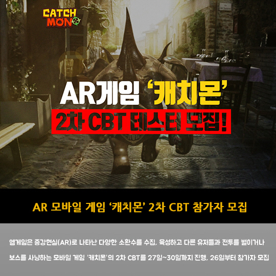 엠게임은 증강현실(AR)로 나타난 다양한 소환수를 수집, 육성하고 다른 유저들과 전투를 벌이거나 보스를 사냥하는 모바일 게임 '캐치몬'의 2차 CBT를 27일~30일까지 진행, 26일부터 참가자 모집