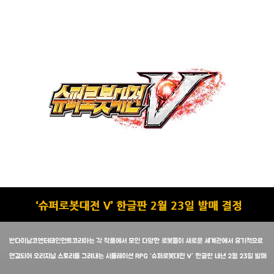 반다이남코엔터테인먼트코리아는 각 작품에서 모인 다양한 로봇들이 새로운 세계관에서 유기적으로 연결되어 오리지널 스토리를 그려내는 시뮬레이션 RPG '슈퍼로봇대전 V' 한글판 내년 2월 23일 발매