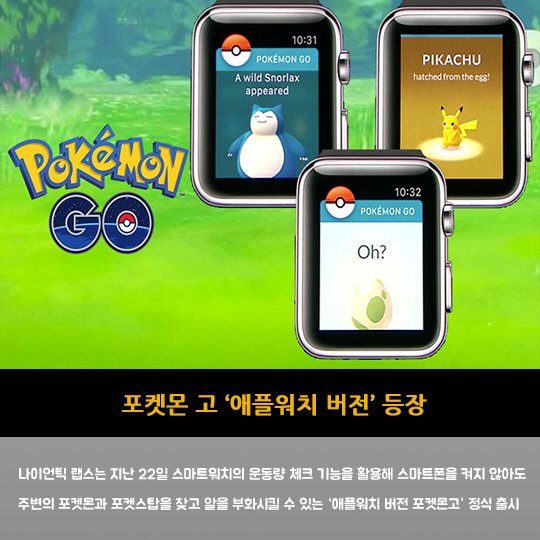 나이언틱 랩스는 지난 22일 스마트워치의 운동량 체크 기능을 활용해 스마트폰을 켜지 않아도 주변의 포켓몬과 포켓스탑을 찾고 알을 부화시킬 수 있는 '애플워치 버전 포켓몬고' 정식 출시