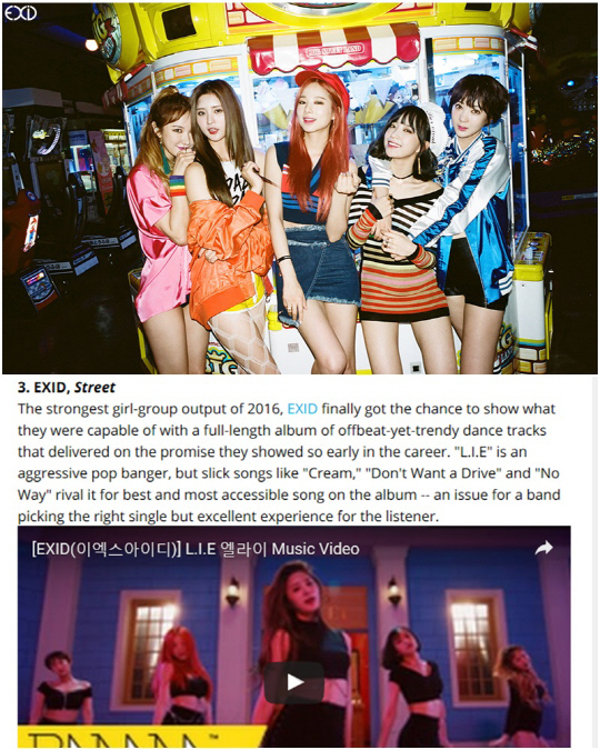 한편 EXID의 'STREET(스트리트)' 앨범은 팀 멤버 LE가 프로듀서로 참여해 화제를 모았다. 기존의 화려한 퍼포먼스와 걸크러시 콘셉트에서 더욱 진화한 모습을 선보였으며, 타이틀 곡 'L.I.E'(엘라이)는 주요 음원차트 실시간 1위를 비롯해 '쇼! 챔피언', '인기가요', '더 쇼' 등 국내 음악방송 1위에 올랐다.