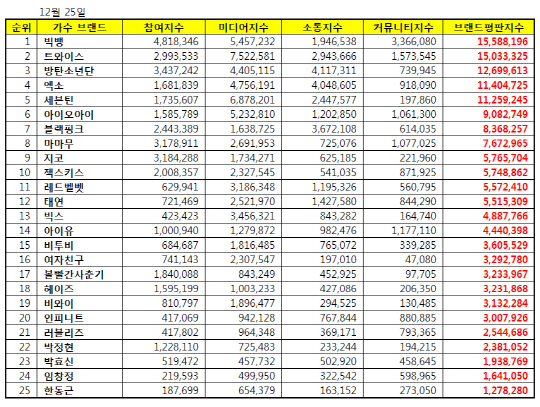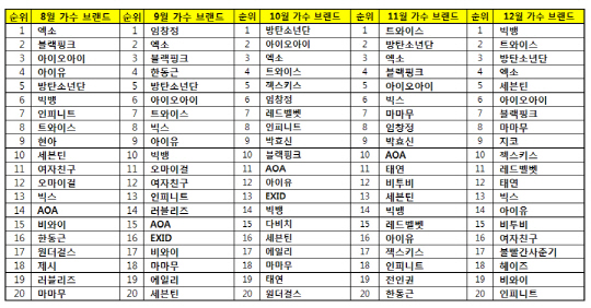 12월 가수 브랜드평판 순위는 빅뱅, 트와이스, 방탄소년단, 엑소, 세븐틴, 아이오아이, 블랙핑크, 마마무, 지코, 젝스키스, 레드벨벳, 태연, 빅스, 아이유, 비투비, 여자친구, 볼빨간사춘기, 헤이즈, 비와이, 인피니트, 러블리즈, 박정현, 박효신, 임창정, 한동근 순으로 분석되었다.