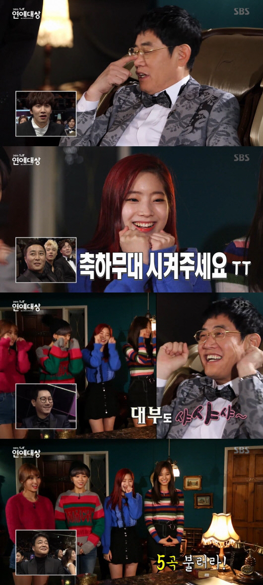 트와이스 멤버들은 "연예대상 축하무대를 하고 싶다"며 애교를 부렸고, 이경규는 맛보기 노래를 보여달라고 요청했다. 이에 멤버들은 'Cheer Up'을 불렀고, 이경규는 멤버들과 함께 '샤샤샤' 안무까지 선보였다.