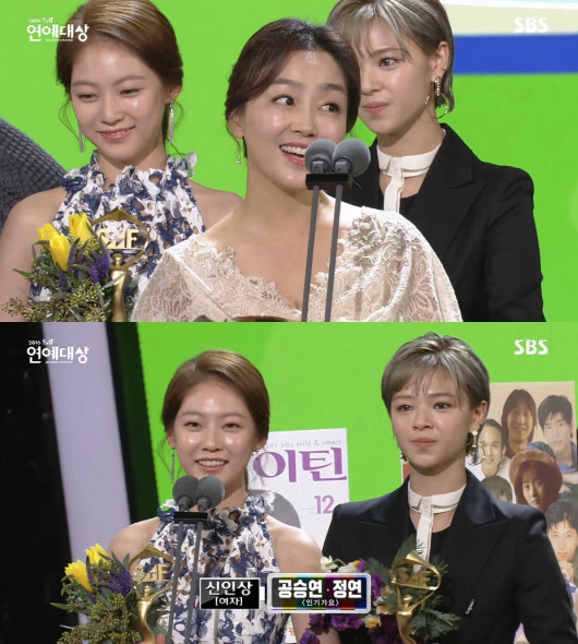이날 이연수와 공승연-정연 자매는 여자신인상을 공동 수상했다. '불타는 청춘'에서 활약 중인 이연수는 "너무 떨린다. '불청' 모든 관계자 분들께 감사드린다. 2016년에 '불타는 청춘'을 만나서 제 인생을 산 거 같다. 다시 불태운 거 같다. 꿈은 찾는게 아니라 만들어 가는 거라는 말이 있는데 앞으로 하나하나 만들어 가겠다"며 눈시울을 붉혔다. 이어 "저를 아껴주시는 모든 분들께 감사드리고, 불청 식구들께 감사드린다. 사랑한다"고 덧붙였다. '인기가요' MC로 활약 중인 공승연-정연 자매는 "이렇게 상 받을 줄 몰랐는데 좋은 상 주셔서 감사드린다"며 "저희가 인기가요 하면서 정말 많이 행복했다. 앞으로 더 열심히 하겠다. 이 상 민석 오빠랑 같이 받는 거라고 생각하겠다"고 말했다.