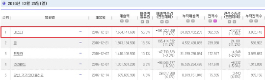 또한 '마스터'는 개봉 첫 주 5일간 누적 관객수 3,002,140명을 동원, '변호인'(개봉 첫 주 175만)과 '국제시장'(개봉 첫 주 155만 명)의 첫 주 흥행 스코어를 훌쩍 뛰어넘으며, 역대 12월 개봉 첫 주 최다 관객수를 기록했다.