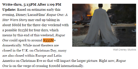 이로써 '로그 원'은 개봉 10일 만에 북미에서만 흥행수익 3억 달러를 돌파했다. 개봉 8일 차였던 지난 23일 '캡틴 아메리카: 시빌 워'를 제치고 올해 가장 빠른 흥행을 기록한 '로그 원'은 개봉 10일차 북미 박스오피스 기준 '어벤져스: 에이지 오브 울트론' (3억 1,340만 달러)와 '다크 나이트' (3억 1,378만 달러)를 앞서는 수치로 역대 흥행 4위에 올라섰다.