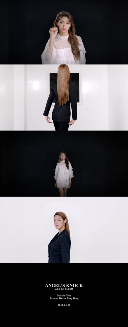 이어 '더블 타이틀(Double Title) 익스큐즈 미(Excuse Me) VS 빙빙(Bing Bing) 2017.01.02'이라는 자막과 함께 영상이 마무리 돼 시선을 사로잡았다. AOA는 더블 타이틀곡을 내세운 이번 앨범을 통해 음악적 자신감과 다양한 매력을 전할 예정이다.