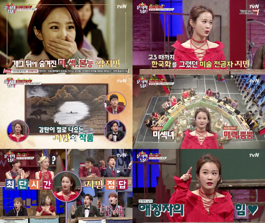 모두를 놀라게 한 건 미술 실력만이 아니었다. 김지민은 이장원을 향해 "얼굴도 잘생기셨는데 후드티를 안 입었으면 좋겠어요"라며 '문제적 남자' 멤버들조차 몰랐던 이장원의 남다른 후드티 사랑을 캐치해내며 '문제적 남자' 애청자임을 인증했다.