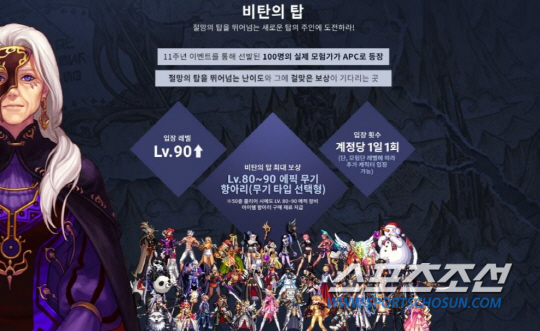 던파 유저 중 100명을 선정하고, 이들을 게임 내 콘텐츠로 등장시키는 '비탄의 탑'도 눈길을 끈다. 90레벨 이상의 유저가 참가할 수 있는 '비탄의 탑'에서는 던파 유저 중 선정된 100명의 유저와 대결을 펼치게 되며, 계정 당 하루에 한 개의 캐릭터만 입장할 수 있다. 50층까지 클리어 시에는 8~90레벨의 '에픽 장비 항아리' 구매 재료가 주어지며, 100층에서는 8~90레벨의 '에픽 아이템 무기 항아리'가 주어진다.