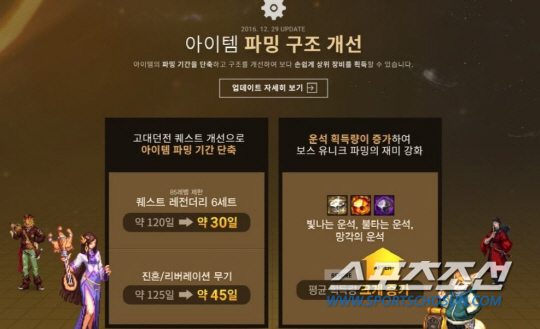 또한 현재 120일 정도 걸리는 85레벨 퀘스트 레전더리 장비와 진혼/리버레이션의 무기 강화 기간이 감소된다. 개발사 측의 설명에 따르면 퀘스트 레전더리 장비 6세트의 강화 기간은 30일까지 단축되며, 진혼/리버레이션 무기 파밍 기간도 현행 125일에서 45일 정도로 줄어든다.