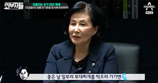 전여옥 전 의원은 "반기문은 부대찌개 같은 남자"라고 발언해 패널들을 놀라게 했다. 전여옥은 "부대찌개는 미군부대에서 나온 재료를 가지고 재활용한 음식이 아니냐. 반기문 유엔 사무총장이 해외에서 가진 이미지만을 갖고 들어와 재탕을 하는 느낌이 든다"고 꼬집었다.