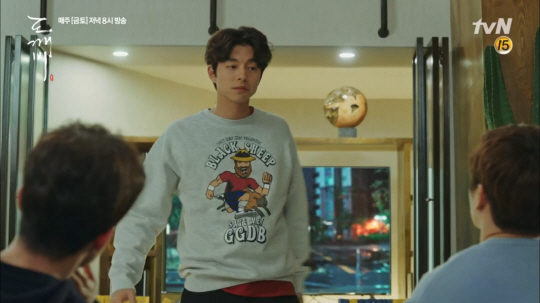 이동욱은 저승사자 답게 좀 더 무거운 분위기의 홈웨어 스타일을 연출했다. 블랙 컬러로 좀 더 무게감있는 느낌을 주었고 프린팅이나 패턴대신 심플한 레터링을 이용해 미니멀한 분위기를 강조했다. 특히 새하얀 그의 피부 톤과 블랙 컬러가 매치되 더욱 엣지있는 느낌을 주었다. 문수권 세컨 제품.