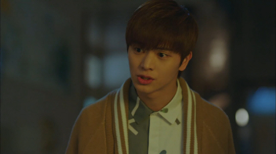 공유, 이동욱 보다 젊고 발랄한 캐릭터를 보여주고 있는 육성재는 위트넘치는 패턴 셔츠에 귀여운 가디건을 더했다. 숄 칼라 형태로 연출된 브라운 컬러 가디건에 라인과 레터링 디테일을 더해 스쿨룩의 분위기를 담았다. 캐주얼하고 편안한 육성재와 환상 캐미를 보여주고 있는 아이템. 문수권 세컨 제품.