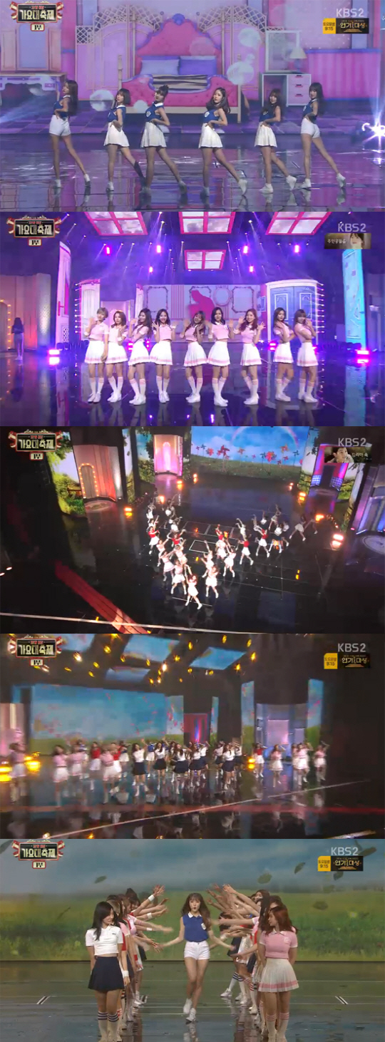 올 한해 최고의 활약을 선보인 '대세 걸그룹' 아이오아이, 트와이스, 레드벨벳, 여자친구가 모여 '1등 걸그룹'이자 선배인 소녀시대의 데뷔곡인 '다시 만난 세계'의 무대는 부드러우면서도 발랄함이 가득한 분위기로 재해석했다.
