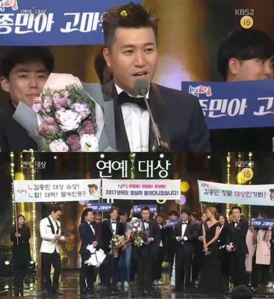 [스포츠조선 조지영 기자] 배우 차태현(40)이 KBS2 예능프로그램 '해피선데이-1박 2일'(이하 '1박 2일')를 통해 '2016 KBS 연예대상' 대상을 수상한 김종민에 대해 "KBS의 과감한 결단이다"고 너스레를 떨었다.