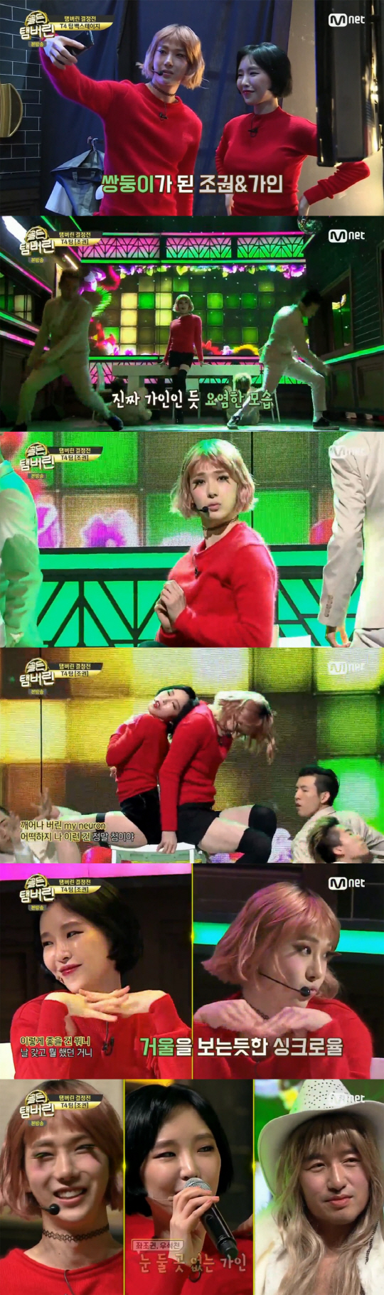이어 조권이 요염한 모습으로 무대에 등장, '피어나' 무대를 완벽하게 소화했다. 무대가 무르익자 가인이 깜짝 등장했고 방청객들은 환호성을 질렀다. 가인과 조권은 안무 동작 하나하나 흐트러짐 없이 표현했다. 두 사람의 폭발적인 케미는 93점을 기록하며 우승을 차지했다.