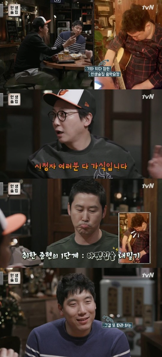 이에 탁재훈은 만취 상태로 잠든 김준현의 모습을 깜짝 공개했다. 사진 속 김준현은 기타를 품에 안은 채로 잠들어있었다. 김준현은 자신도 몰랐던 모습에 당황했고, 이에 신동엽은 "우린 촬영이 끝나도 계속 마신다"고 설명했고, 탁재훈은 "시청자분들이 보시는 건 다 가식"이라고 말해 웃음을 자아냈다.<스포츠조선닷컴>