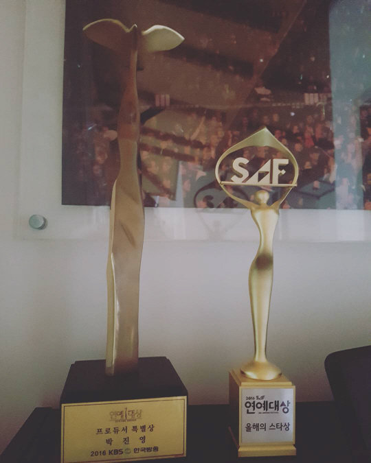 박진영은 30일 자신의 SNS에 "이 상들이 주는 기억이 정말 소중할 것 같아요. 이 상들을 볼 때마다 언니쓰와 K팝스타가 떠오를 것 같아요"라는 글과 함께 사진을 올렸다.