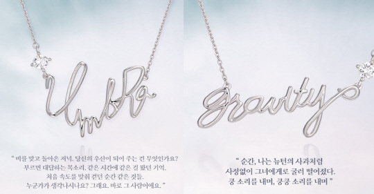 김은숙 작가는 한 주얼리 브랜드와 콜라보레이션 작업을 통해 이 목걸이를 탄생시켰다. 단순히 외면적인 아름다움을 고려하기 보단 '도깨비'의 운명적인 스토리에서 영감을 받아, 극중 불멸의 연인인 도깨비 김신(공유)와 지은탁(김고은)이 실제 주고받은 아름다운 대사들을 레터링과 그림으로 함축해 표현했다. 드라마계 시인이라 불리우는 김은숙 작가 특유의 감성적이고 주옥같은 대사들이 직접적으로 담겨 있다. 디자인과 의미가 딱 맞아떨어지는, 작가가 탄생시킨 감성 아이템인 것이다.